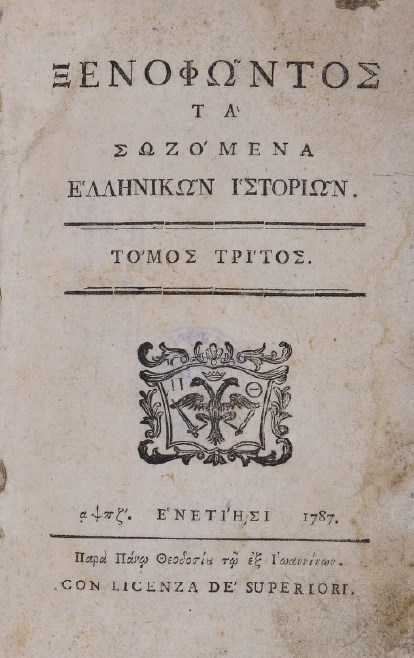 | Бібліографічний опис: | Ξενοφών (Xenophon ; π. 430 – 355 π. Χ.). Ξενοφώντος τα σωζόμενα … : [σε 4 τ.]. – Ενετίησιν : παρά πάνω Θεοδοσίου τω εξ Ιωαννίνων, 1787. Τ. 3 : … Ελληνικών ιστοριών. – 1787. – [4], 389, [1] σ. ; 8⁰ (18x12x2,5 εκ.). |