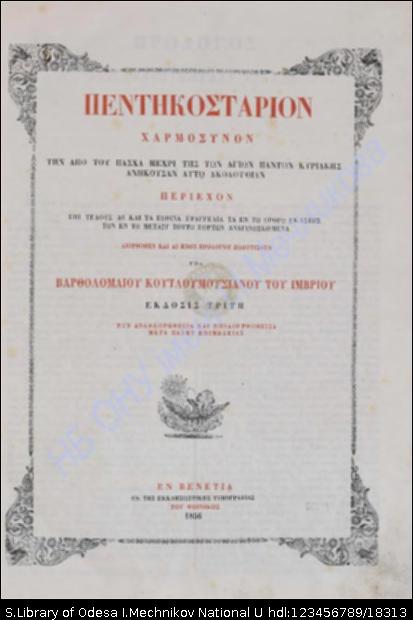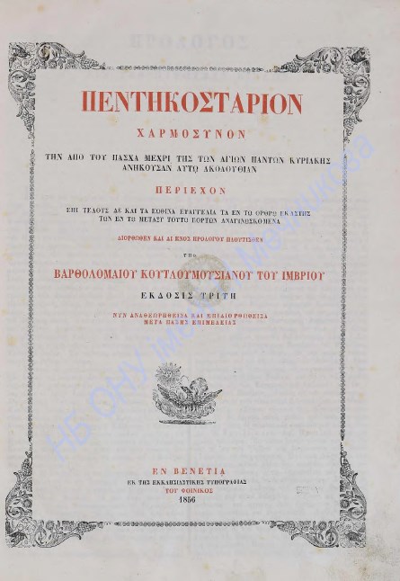 Бібліографічний опис: Πεντακοστάριον : χαρμόσυνον, την από του Πάσχα μέχρι της των Αγίων Πάντων Κυριακής ανήκουσαν αυτώ ακολουθίαν περιέχον επί τέλους και τα Εωθινά Ευαγγέλια τα εν τω όρθρω εκάστης των εν τω μεταξύ τούτω εορτών αναγινωσκόμενα / διορθωθέν και δι΄ενός προλόγου πλουτισθέν υπό Βαρθολομαίου Κουτλουμουσιάνου του Ίμβριου. – 3η έκδ. – Βενετια [Venezia] : Εκ της εκκαησιαστικης τυπ. του Φοινικος, 1856. – 8, 236 σ., 1 φ. χαλκογρ.
