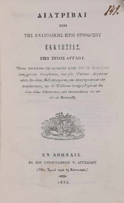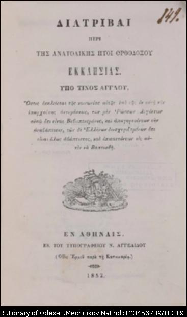 | Назва: | Διατριβαί περί της Ανατολικής ήτοι Ορθοδόξου Εκκλησιασ |