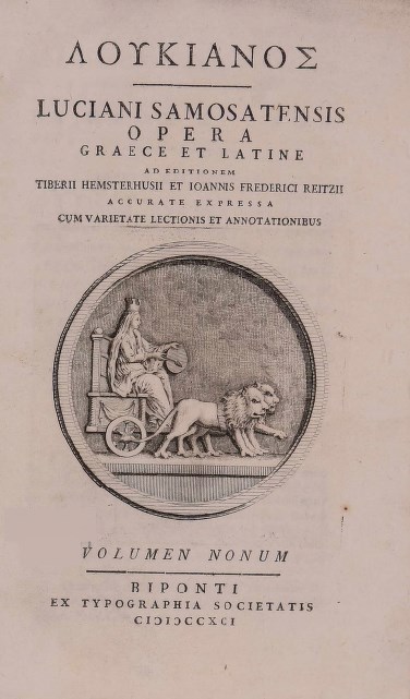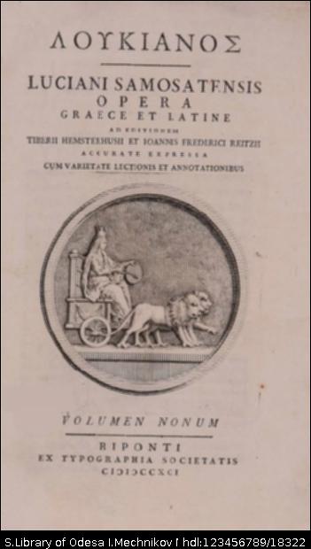 | Бібліографічний опис: | Λουκιανὸς ὁ Σαμοσατεύς (Lucianus Samosatensis ; 125 – 180 μ. Χ.). Λουκιανός = Luciani Samosatensis Opera Graece et Latine : [in 10 vol.] / ad editionem Tiberii Hemsterhusii et Ioannis Frederici Reitzii Accurate Expressa cum variae lectionis et annotationibus. – Bipontum [Zweibrücken] : ex typographia Societatis, 1789–1793. Vol. 9. – 1791. – [2], 605, [1] p. ; 8° (18,7x11,9x3 cm). |