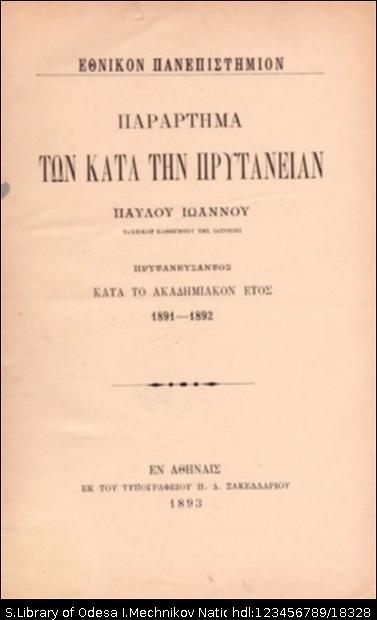 | Назва: | Παραρτημα των κατα την πρυτανειαν Παυλου Ιωαννου ... |