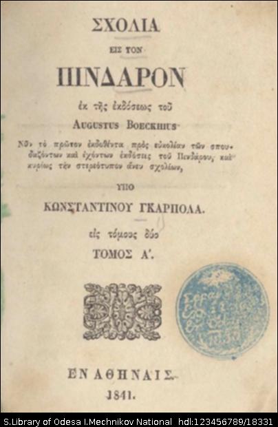 | Бібліографічний опис: | Böckh, Philipp August (1785-1867). Σχολια εις τον Πινδαρον : σε 2 τ. / εκ της εκδόσεως του Augustus Boeckhius ; νυν το πρώτον εκδοθέντα προς ευκολίαν των σπουδαζόντων και εχόντων εκδόσεις του Πινδάρου, και κυρίως την στερεότυπον άνευ σχολίων, υπο Κοωσταντινου Γκαρπολα. – Αθηνα : Τυπ. Κ. Γκαρπολά, 1841. T. 1. – 1841. – [4], 348, [4] σ. |