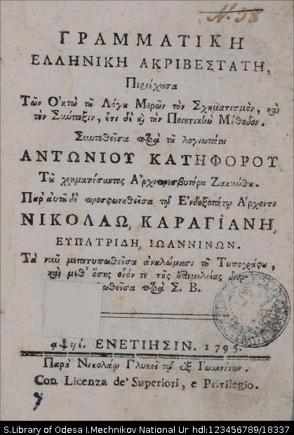 | Бібліографічний опис: | Γραμματικη ελληνικη ακριβεστατη, : περιέχουσα των οκτώ του λόγου μερών τον σχηματισμόν, και την σύνταξιν, έτι δε και την ποιητικήν μέθοδον / συντεθεισα παρα Αντωνιου Κατηφορου … – Ενετιησιν [Venezia] : παρά Νικολάω Γλυκεί τω εξ Ιωαννίνων, 1795. – [6], 358, [2] σ. ; 8⁰ (16x11x2 εκ.). |