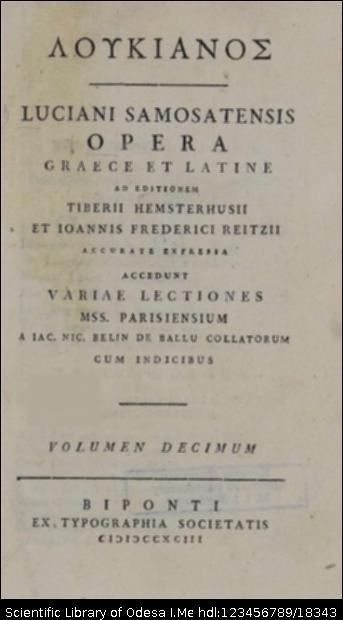 | Бібліографічний опис: | Λουκιανὸς ὁ Σαμοσατεύς (Lucianus Samosatensis ; 125 – 180 μ. Χ.). Λουκιανός = Luciani Samosatensis Opera Graece et Latine : [in 10 vol.] / ad editionem Tiberii Hemsterhusii et Ioannis Frederici Reitzii Accurate Expressa cum variae lectionis et annotationibus. – Bipontum [Zweibrücken] : ex typographia Societatis, 1789–1793. Vol. 10. – 1793. – [2], 367, [313] p. ; 8° (18,7x11,9x3,5 cm). |
