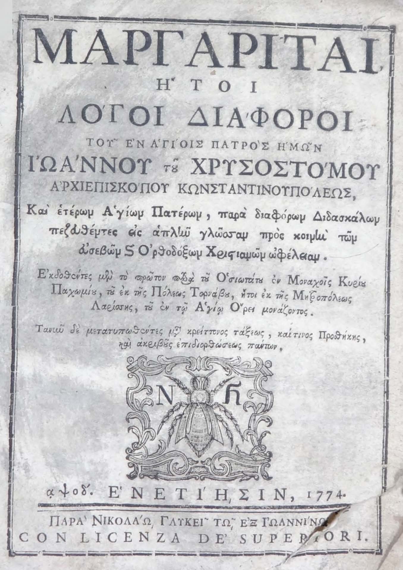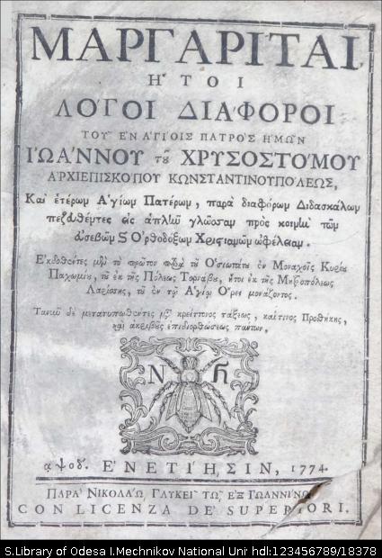 | Бібліографічний опис: | Ιωάννης ο Χρυσόστομος (αγιος; πιθ. 349 – 407). Μαργαρίται : ήτοι λόγοι διάφοροι του εν αγίοις πατρός ημών Ιωάννου του Χρυσοστόμου αρχιεπισκόπου Κωνσταντινουπόλεως και ετέρων αγίωνπατέρων μεταφρασθέντες εις απλήν γλώσσαν προς κοινήν των ορθοδόξων χριστιανών ωφέλειαν / συλλεχθέτες … του οσιωτάτου εν Μοναχοίς, Κυρίου, Παχωμίου του εκ της Πόλεως Τουρνάβου, ήτοι εκ της Μητροπόλεως Λαρίσσης, του εν τω Αγίω Όρει μονάζοντος. – Ενετίησιν [Venezia] : παρά Νικολάω Γλυκεί τω εξ Ιωαννίνων, 1774. – VII, [1], 368 ς. ; 8⁰ (22,5х17х3 εκ). |
