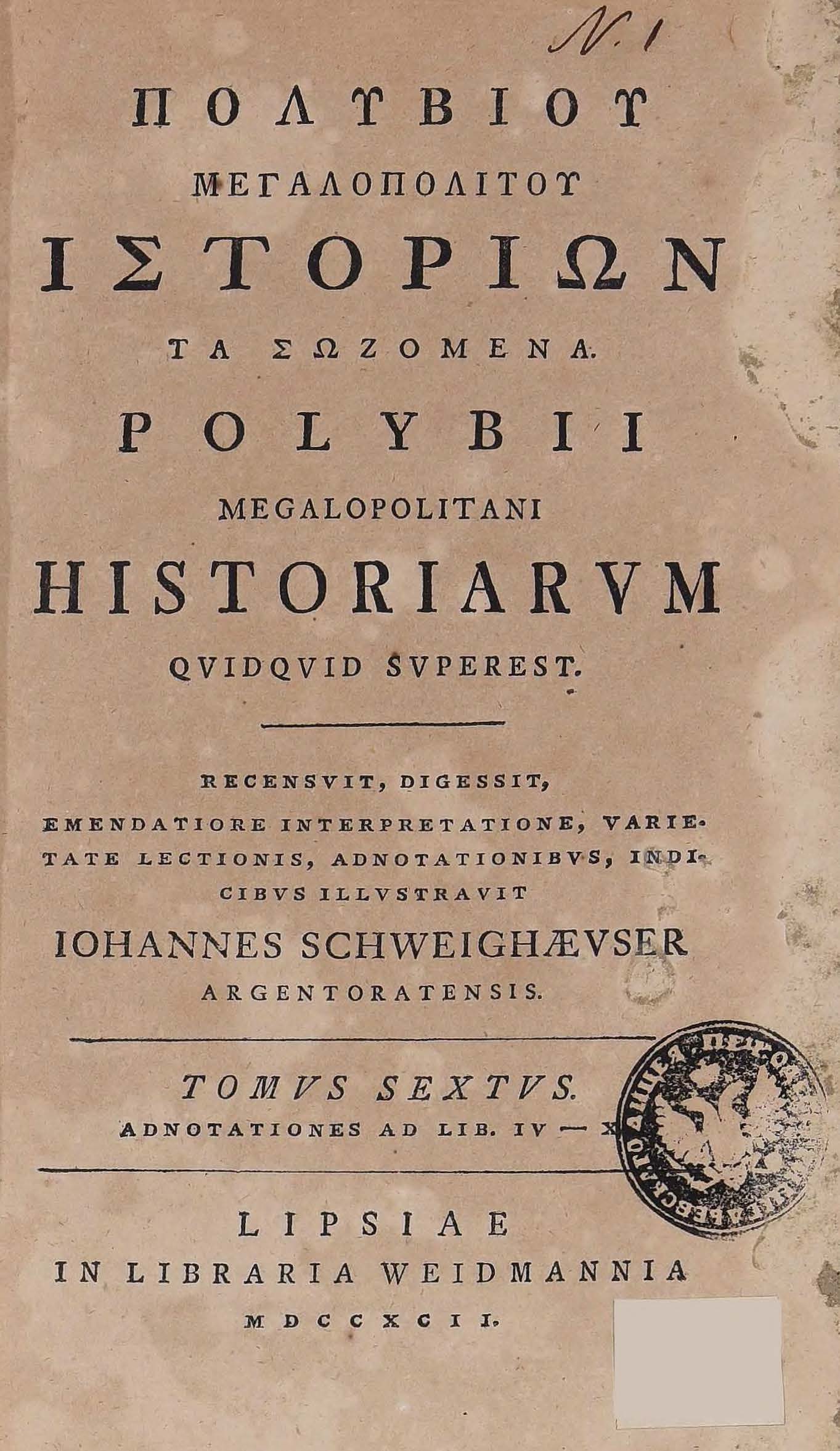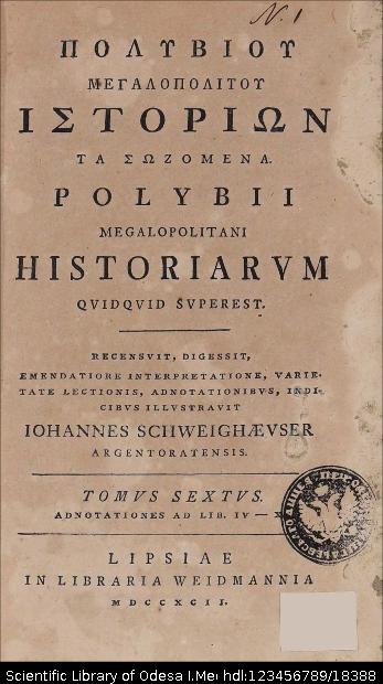 | Бібліографічний опис: | Πολυβιος (Polybius ; 202 π. Χ. – 120 π. Χ.). Πολυβιου Μεγαλοπολιτου ιστοριων τα σοζομενα = Polybii Megapolitani historiarum quidquid superest : [in 8 t.] / recensuit, digessit, emendation interpretation, varietate lectionis, adnotationibus, indicibus illustravit Iohannes Schweighaeuser … – Lipsiae [Liepzig] : in libraria Weidmannia, 1789–1795. T. 6 : Adnotationes ad lib. IV – X. – 1792. – [2], 707, [1] p. ; 8⁰ (21x12,5x4,2 cm). |
