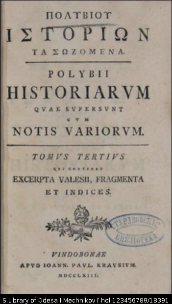| Бібліографічний опис: | Πολύβιος (Polybius; πιθ. 200 – πιθ. 120 π. Χ.). Πολυβου του Λυκορτα Ιστριων τα σωζομενα = Polybii Lycortae f. Historiarum : [in 3 t.] / quae supersunt interprete Isaaco Casaubono ex recensione Jacobi Gronovii cum notis Casaubonorum, Ursini, Valesii, Palmerii et Iacobi Gronovii ; accesit Aeneae Tactici com. de obsidione toleranda cum interpr. et notis Isaci Casauboni. Praefationem et glossarium Polybianum adiecit Io. Augustus Ernesti. – Lipsiae [Leipzig] : apud Io. Paul. Krausium, ..., 1763–1764. T. 3 : ... qui continent excerpta Valesii, fragmenta et indices. – Vindobonae [Wien] ; Lipsiae [Leipzig] : apud Ioann. Paul. Krausium ; ex officina Breitkopfiana, 1763. – [2], 704, [78], 138, [2] p. ; 8⁰ (20x12x4,5 cm). |