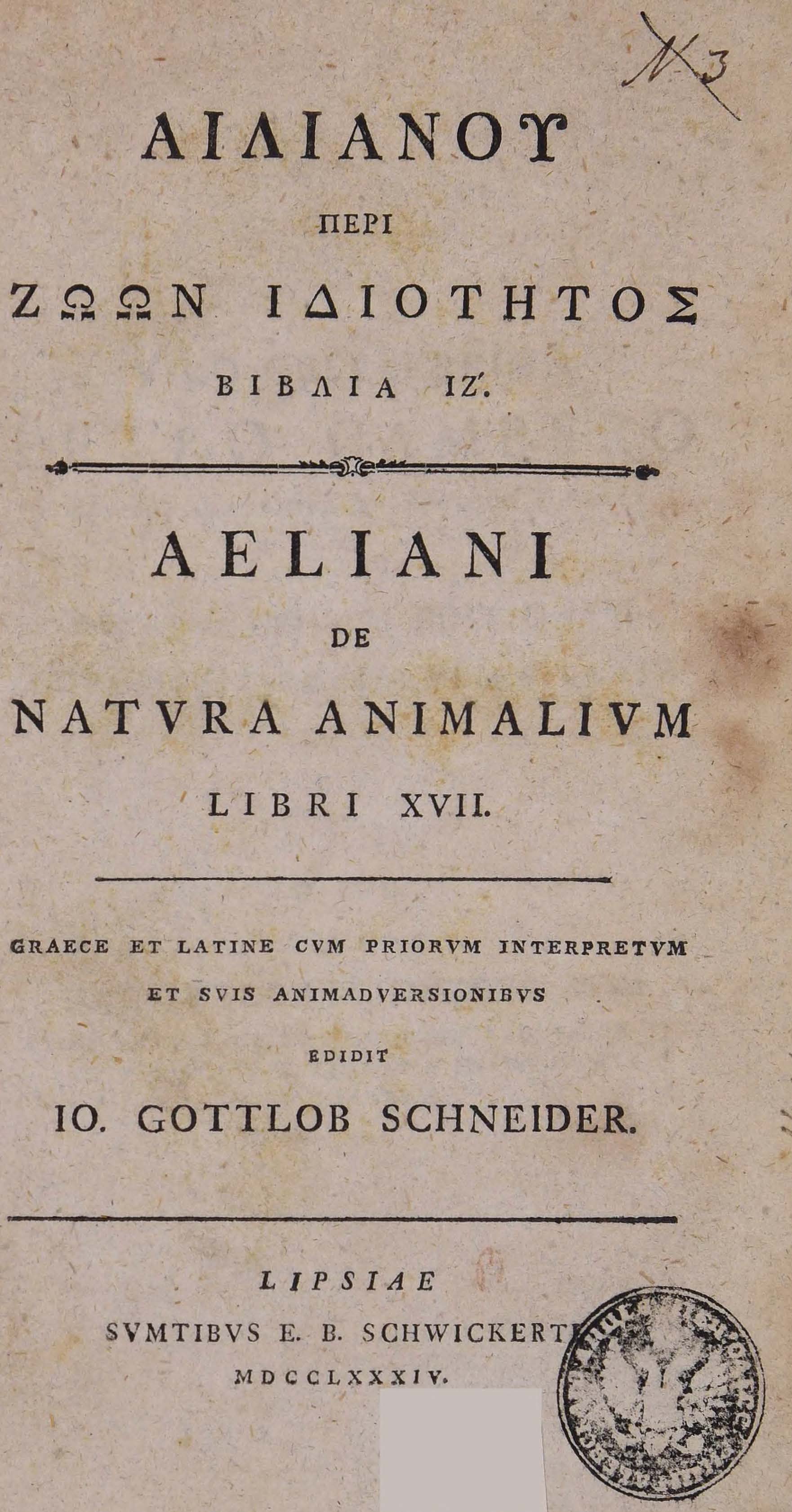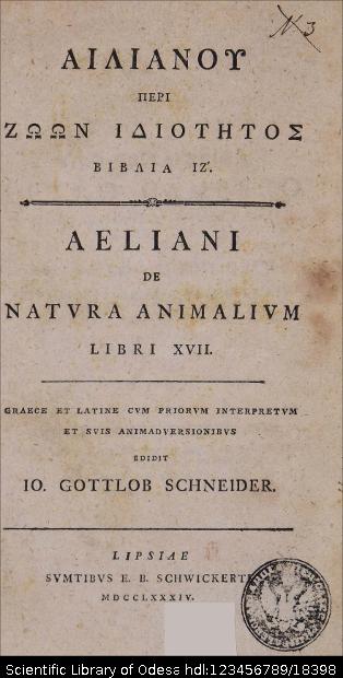 | Бібліографічний опис: | Αιλιανός, Κλαύδιος (Aelianus, Claudius ; περ. 175 – περ. 235 μ. Χ.). Αιλιανου Περι ζωων ιδιοτητος : βιβλια 17 = Aeliani de Natura animalium : libri XVII : graecae et latine ; cum priorum interpretum et suis animadversionibus / edidit Io. Gottlob Schneider. – Lipsiae [Leipzig] : sumptibus E. E. Schwickerti, 1784. – X, 228, [44] p. ; 8⁰ (20,5x12,5x5 cm). |