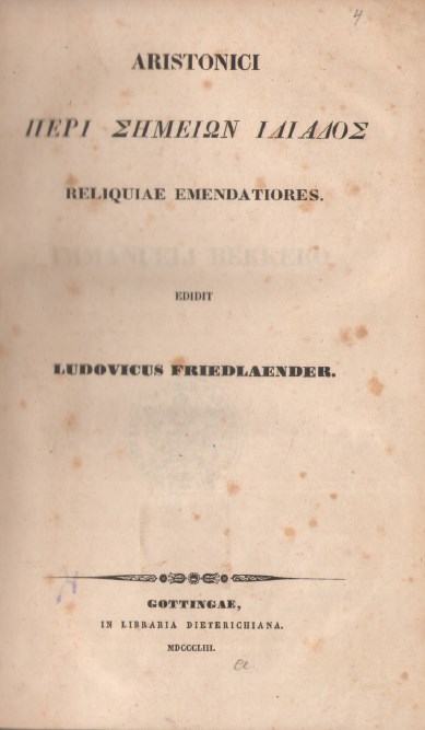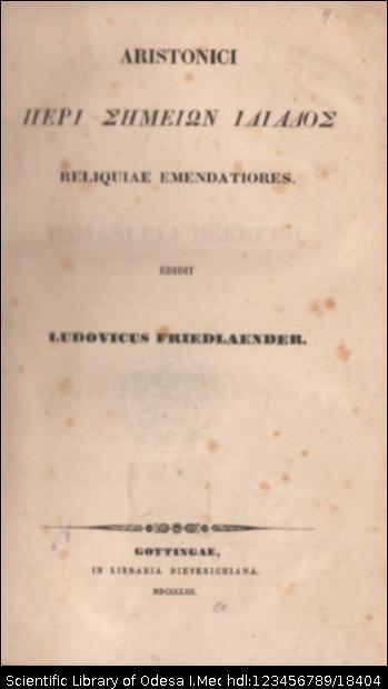 | Бібліографічний опис: | Αριστονικος ο Αλεξανδρευς (1ος αι. π. Χ.). Aristonici Περι σημειων Ιλιαδος reliquiae emendatiores / ed. Ludovicus Friedlaender. – Gottingae [Göttingen] : Libraria Dieterichiana, 1853. – VI, [2], 352, [2] σ. |