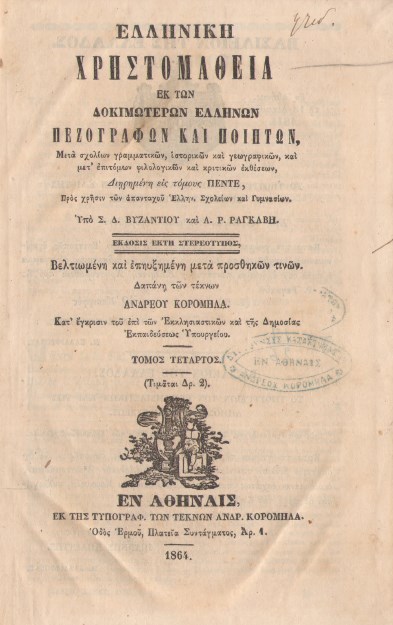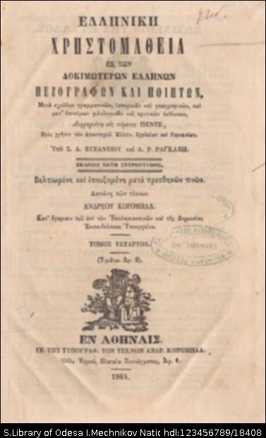 | Назва: | Ελληνικη Χρηστομαθεια εκ των δοκιμωτερων Ελληνων πεζογραφων και ποιητων (τ.4) |