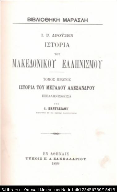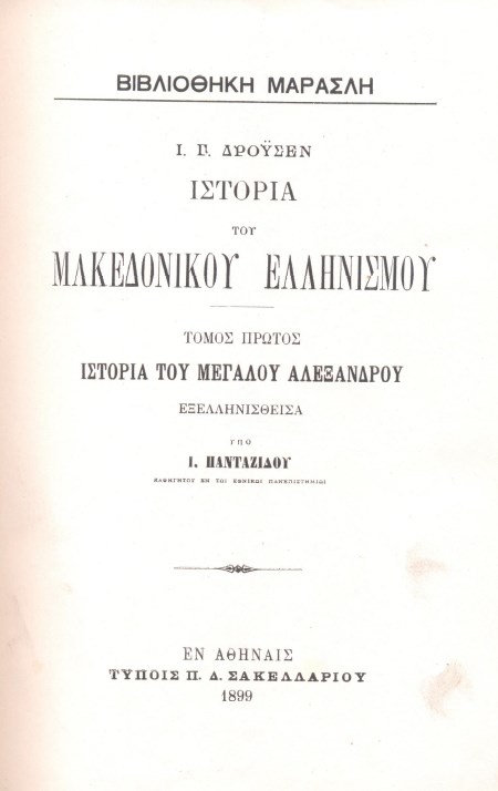 Бібліографічний опис: Δρουσεν, Γιόχαν Γκούσταφ (Droysen, Johann Gustav ; 1808-1884). Ιστορια του Μακεδονικου Ελληνισμου : [σε 2 τ.] / Ι. Γ. Δρουσεν. – Αφηναισ : Τυπ. Π. Δ. Σακελλαριου, 1897-1899. – (Βιβλιοθηκη Μαρασλη. Συλλογη εκκριτηων επιστημονικων χενων τε εν Ελληνικη, μεταφρασει και πρωτοτυπων συγγραμματων). Τ. 1 : Ιστορια του Μεγαλου Αλεχανδρου / εχελληνισθεισα υπο Ι. Πανταζιδου ... – 1899. – 924 σ., 5 φ. χαρτ.
