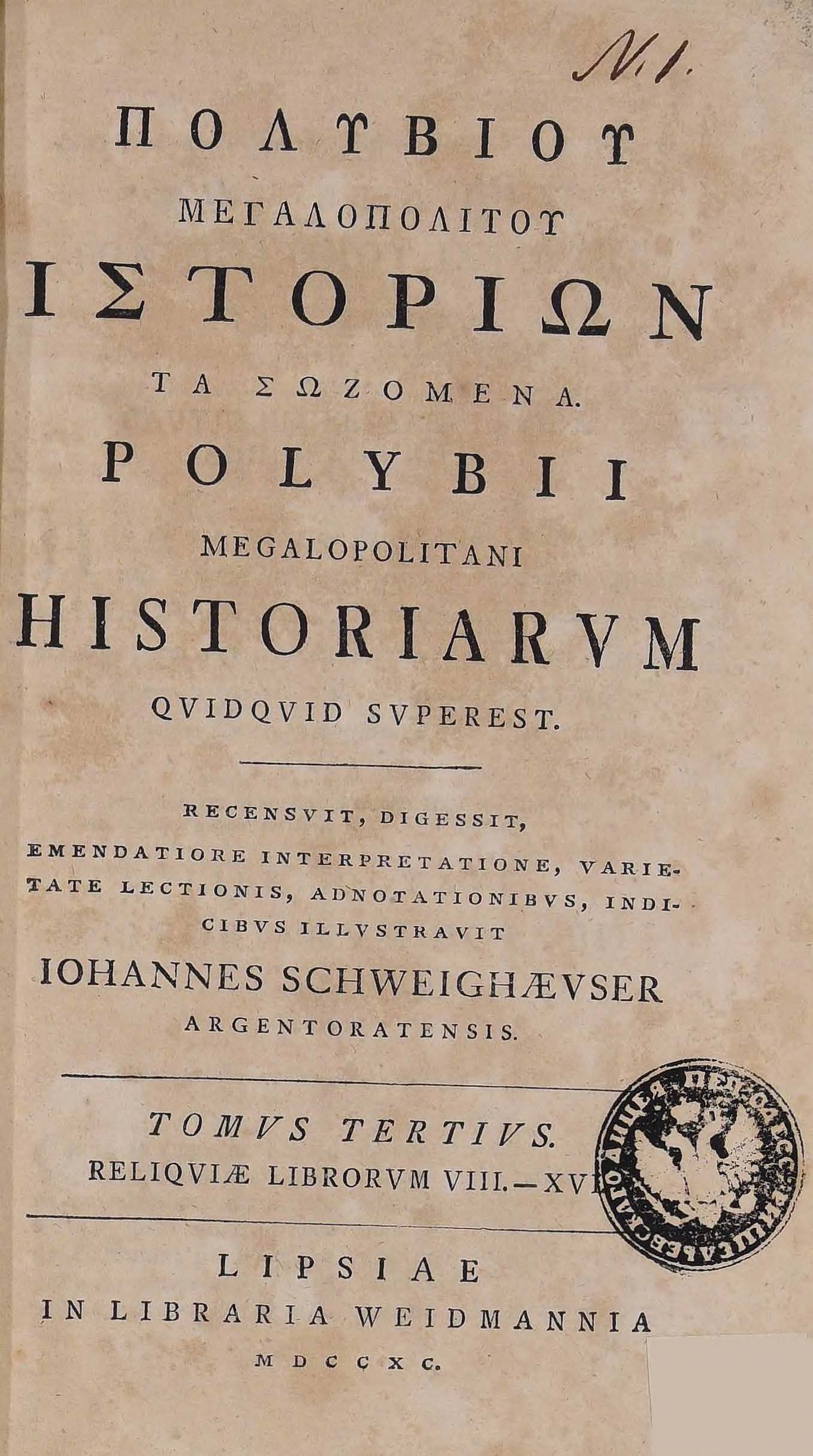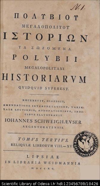 | Бібліографічний опис: | Πολυβιος (Polybius ; 202 π. Χ. – 120 π. Χ.). Πολυβιου Μεγαλοπολιτου ιστοριων τα σοζομενα = Polybii Megapolitani historiarum quidquid superest : [in 8 t.] / recensuit, digessit, emendation interpretation, varietate lectionis, adnotationibus, indicibus illustravit Iohannes Schweighaeuser … – Lipsiae [Liepzig] : in libraria Weidmannia, 1789–1795. T. 3 : Reliquiae librorum VIII. – XVI. – 1790. – 646, [8] p. ; 8⁰ (21x12,5x3,8 cm). |
