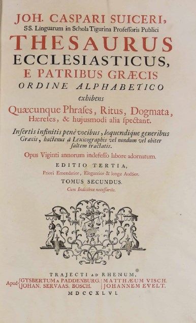 | Бібліографічний опис: | Suicerius, Johann Kaspar (1619–1688). Joh. Caspari Suiceri, ... Thesaurus ecclesiasticus, : e Patribus Graecis ordine alphabetico exhibens quaecunque Phrases, Ritus, Dogmata, Haereses, et hujusmodi alia spectant ; insertis infinitis penè vocibus, loquendique generibus Graecis, hactemus à lexicographis vel obiter saltem tractatis ... ; cum Indicibus necessariis : [in 2 t.]. – Editio tertia, priori emendatior, elegantior et longe auctior. – Trajecti ad Rhenum [Utrecht] : apud Gysbertum a Paddenburg ; Johan. Servaas Bosch ; Matthaeum Visch ; Johannem Evelt, 1746. T. 2. – 1746. – [4] p. ; 1654 col., [64] p. ; 2⁰ (38,5x25x6 cm). |