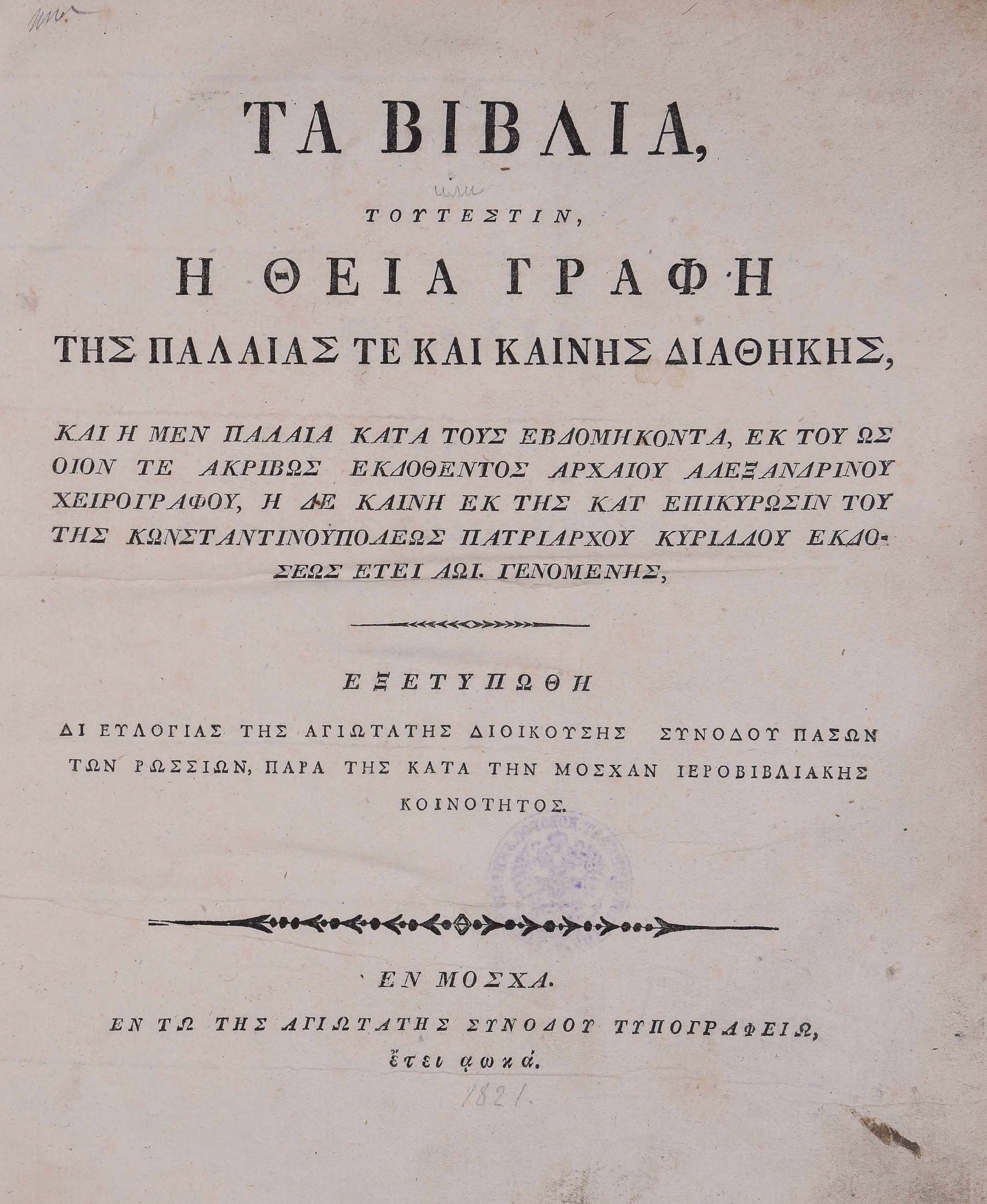 | Бібліографічний опис: | Τα Βιβλία, τουτέστιν, η Θεία Γραφή της Παλαιάς τε και Καινής Διαθήκης, : και η μεν Παλαιά κατά τους Εβδομήκοντα, εκ του ωσ οίον τε ακριβούς εκδοθέντος αρχαίου Αλεξανδρινού χειρογράφου, η δε Καινή εκ τησ κατ επικύρωσιν του της Κωνσταντινουπόλεως Πατριάρχου Κυρίλλου εκδόσεως έτει αωι. Γενομένης ... – Εν Μόσχα : εν τω της αγιωτάτης Συνόδου Τυπογραφείω, 1821. – [4], 248, 334, 225, [1], 173, [1], II, 231, [1], XII, XXVIII, XVIII, XIV σ. |