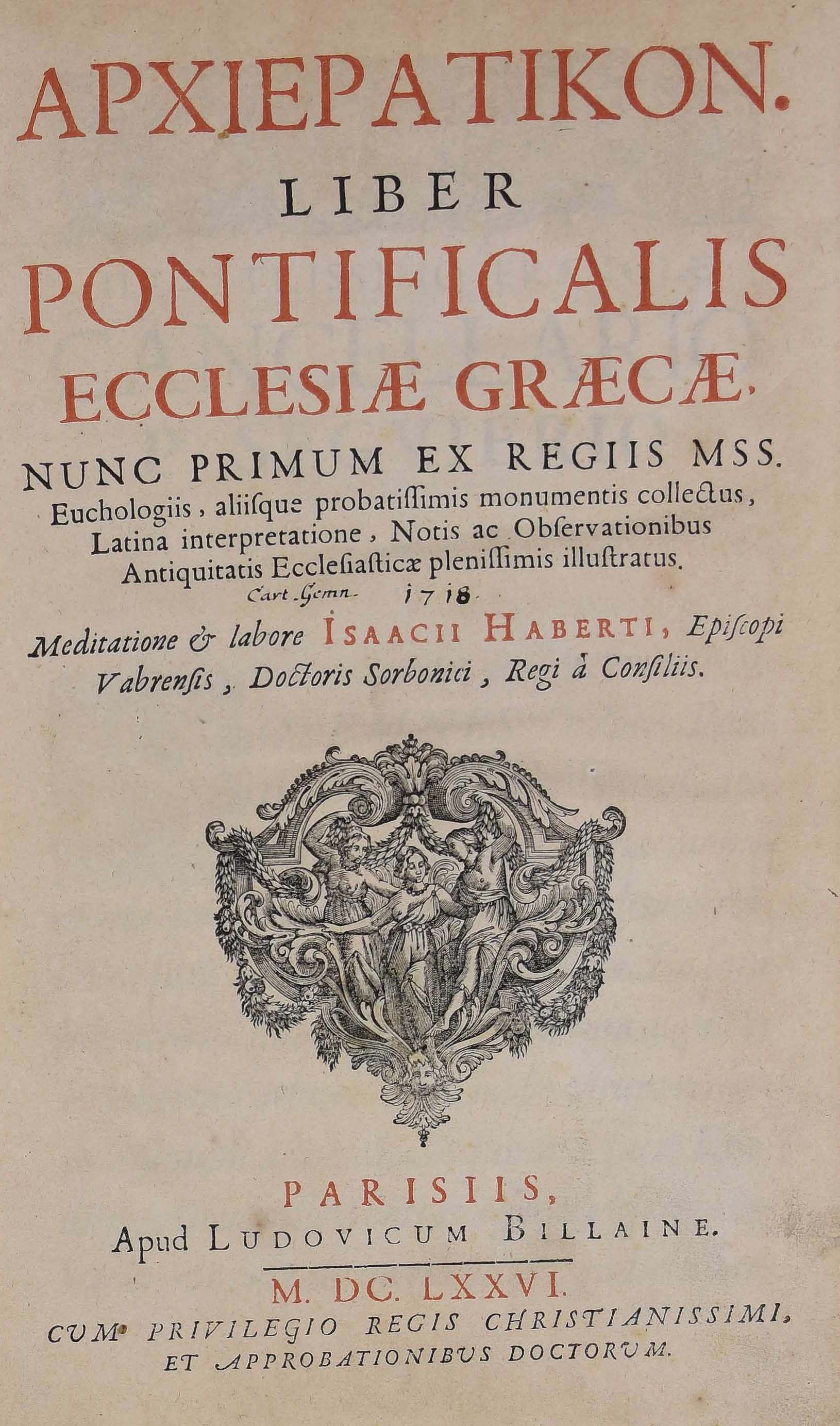 | Бібліографічний опис: | Αρχιερατικον = Liber Pontificalis Ecclesiae Graecae : nunc primum ex regiis MSS. Euchologiis, aliisque probatimus monumentis collectus, Latina interpretatione, notis ac observationibus antiquitatis ecclesiasticae plenissimis illustratus / meditatione et labore Isaacii Haberti … – Parisiis [Paris] : apud Ludovicum Billaine, 1676. – [16], 749, [23] p. ; 2⁰ (35x22x5 cm). |